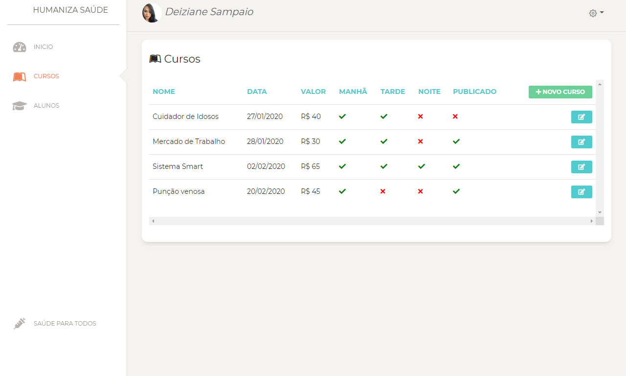 Humaniza Saúde é um sistema criado para gerenciar cadastro de alunos, turmas e cursos na área de saúde. Possui modulo de controle de clientes e alunos, gerenciamento de cursos, gerenciador de conteúdo, geração e emissão de certificados.
